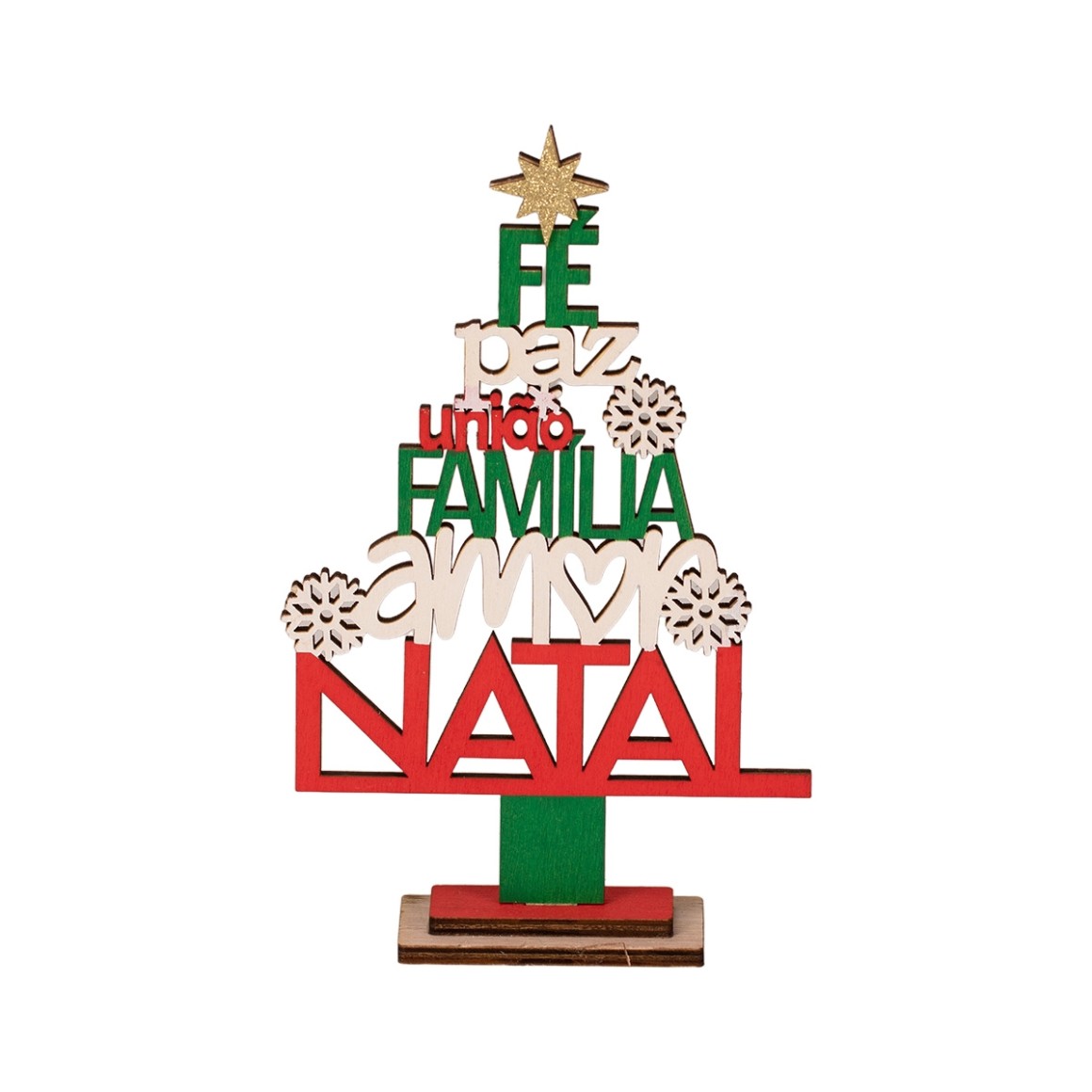 Mini Árvore de Natal formada pelas palavras: "Fé, Paz, União, Família, Amor, Natal"