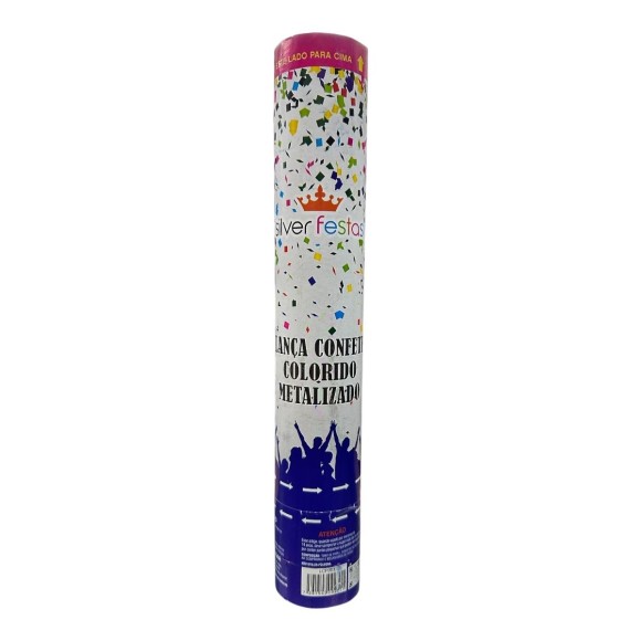 Material: tubo de papel, confetes metalizados, ar comprimido e mecanismo de ferro
