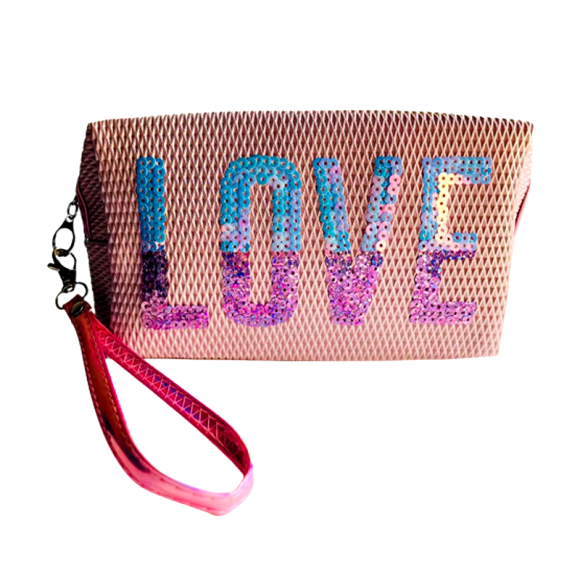 Linda necessaire com zíper, bordada em paetê e alcinha de mão removível.