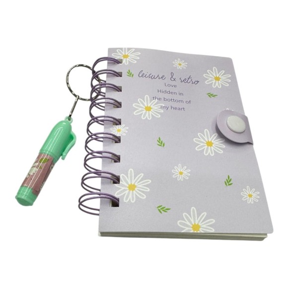 Acompanha mini caneta fixada com argola no espiral do bloco.