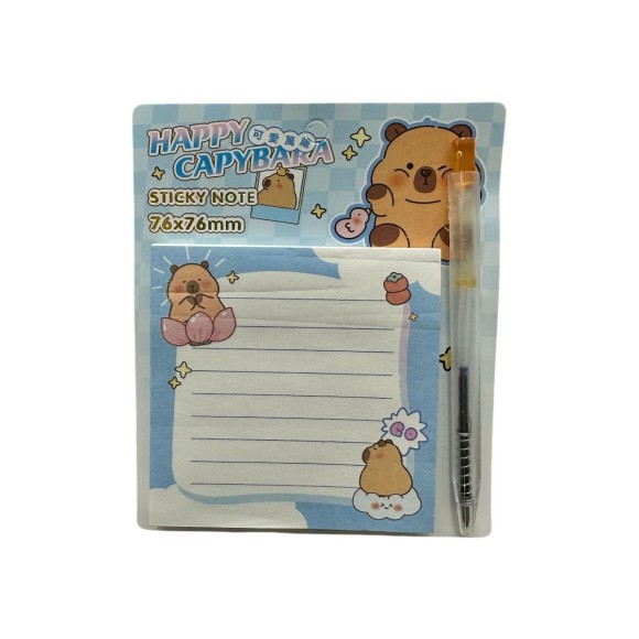O bloquinho é composto por 70 folhas tipo post it tamanho 7,6 x 7,6cm , todas estampadas com tema capivara.
