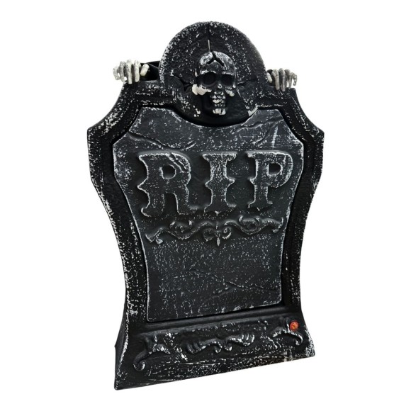 Lapide com som e luz, só acionar o botão que o esqueleto surge por trás da lapide, emitindo sons arrepilantes e acendendo a luz.